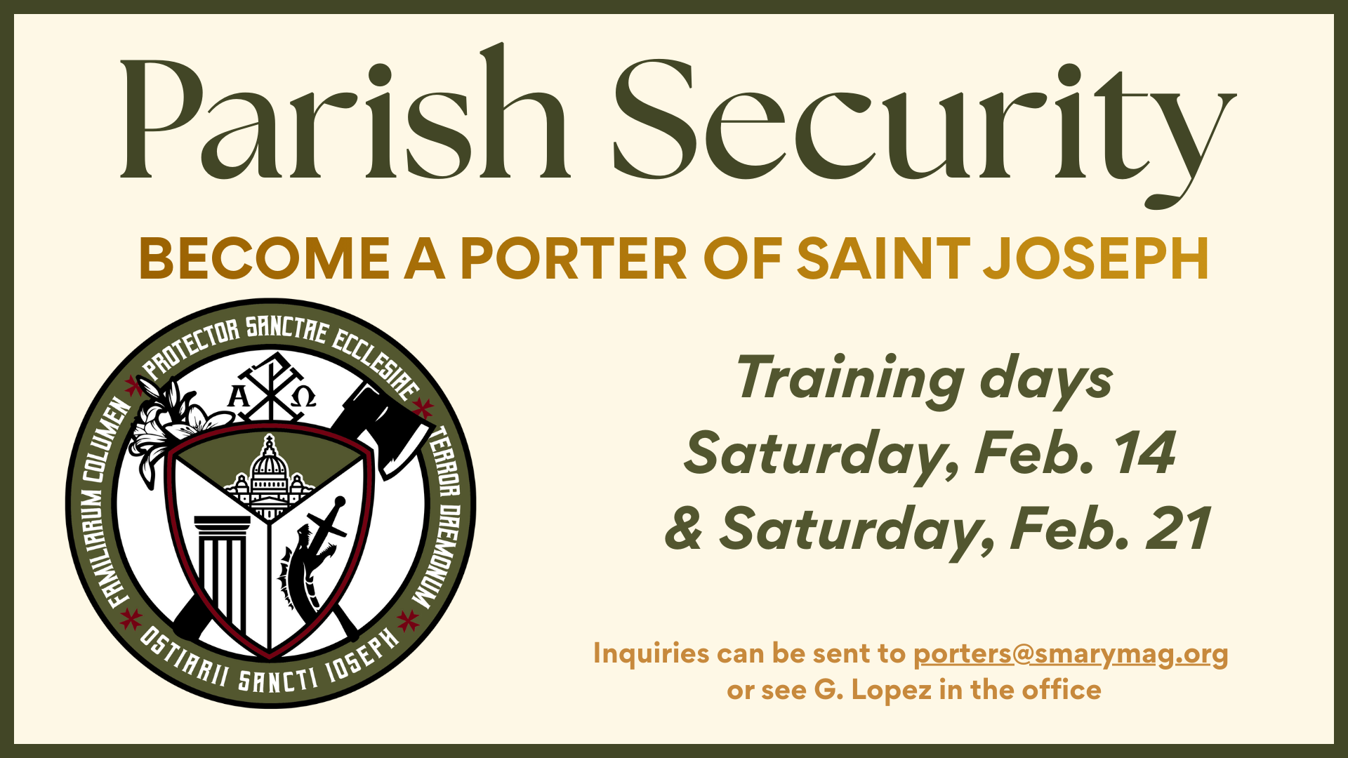 Thank you to all the men who have expressed interest in joining our parish's security team. Many other parishes in our growing diocese have thriving chapters of the Porters of St. Joseph, and Fr. Clote has envisioned a chapter for our parish family since he was first assigned here. Please discern joining, and please consider inviting a friend.